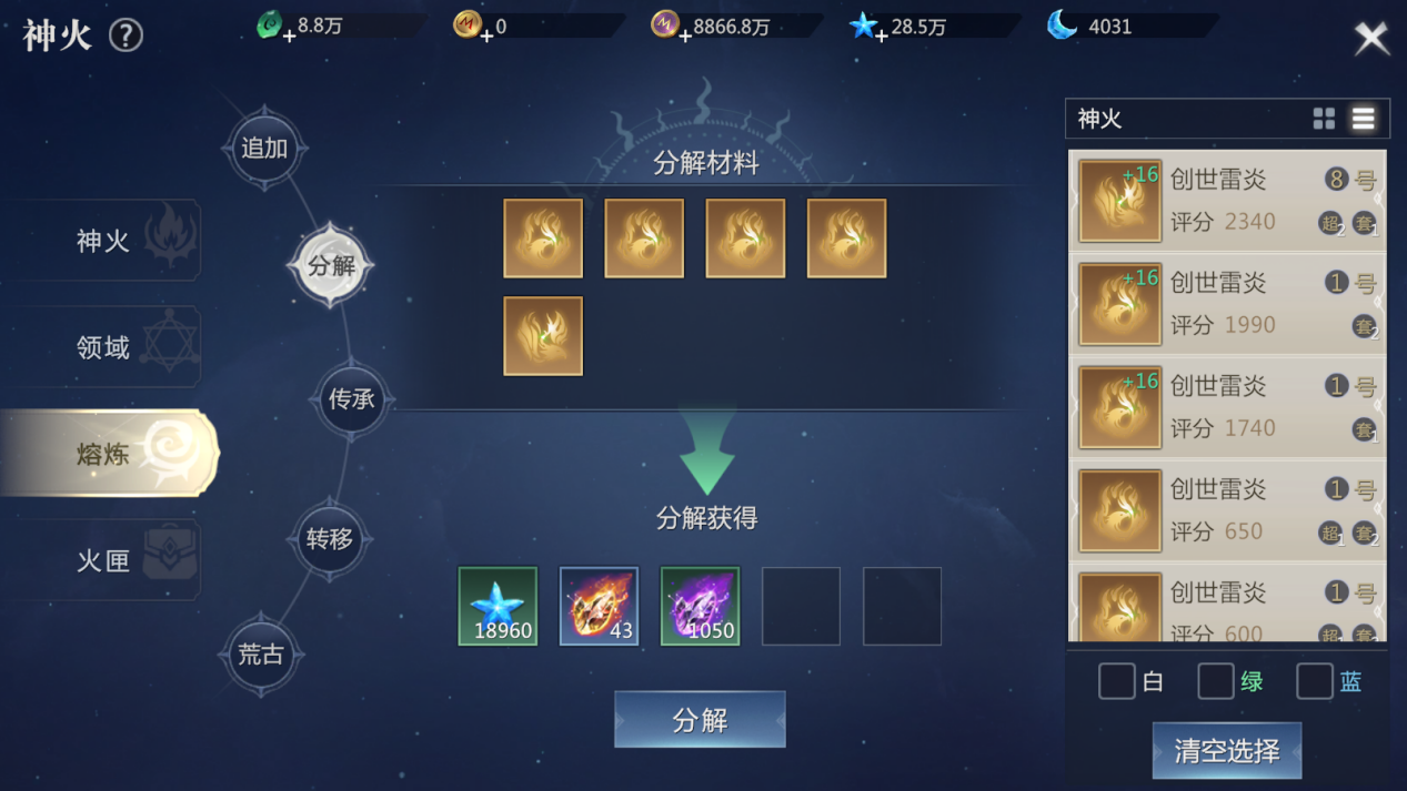 2、根据神火本身、神火是否具有超凡效果以及神火养成情况可获得不同分解物,包括追加材料、星石和月石。