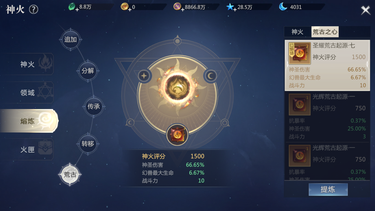 2、荒古提炼:对已熔铸了“荒古之心”的神火进行提炼,可获得适用于对应神火格位的“荒古之心”。提炼后的神火将失去荒古之心及附加效果,提炼并不会影响神火的副属性、套装效果、超凡效果等。(例:“起源·创世雷炎”提炼后还原为“创世雷炎”)