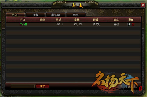 加好友,只需要输入对方名字点击添加,等待对方审核,对方审核通过,双方成为朋友。注意好友一定要是同阵营方可添加。