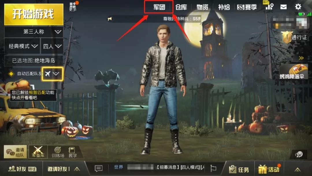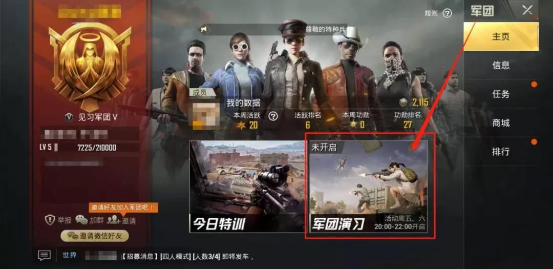 演习入口在大厅的【军团】入口,军团演习开始前5分钟及军团演习期间,大厅军团入口会出现提示,提醒鸡友们来参加演习。