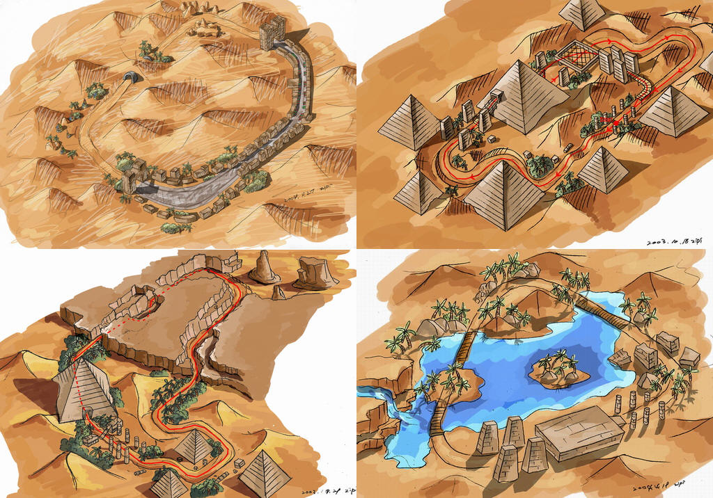 为了把现有赛道的全貌展示给玩家们,同时也让大家了解《跑跑卡丁车》游戏开发中的一些环节,我们特地从众多原画作品中挑选出几副沙漠赛道的场景原画,与大家共同欣赏!
