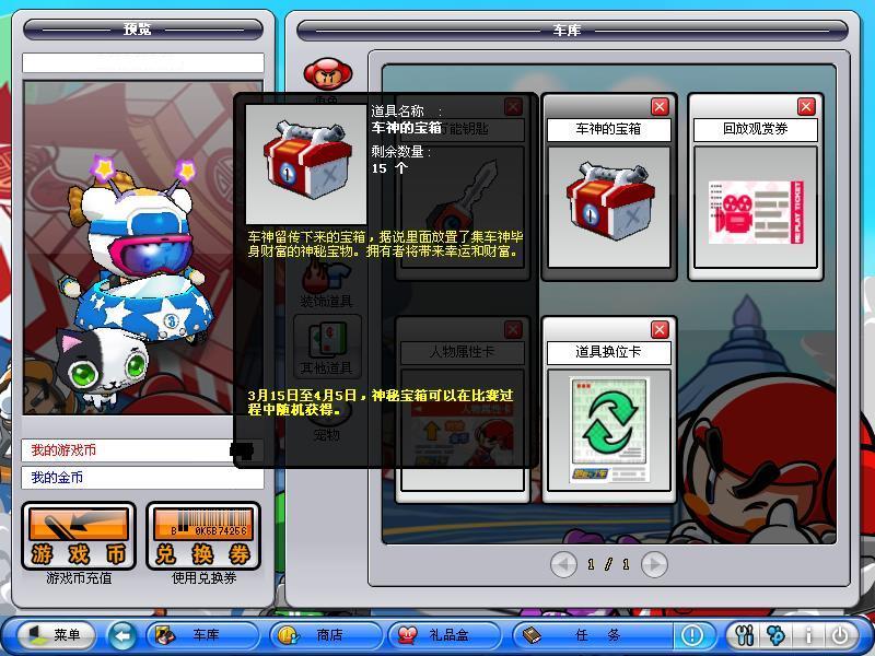 2007年3月15日至5月3日,可购买商店内的****开启宝箱,获得车神的宝物