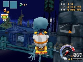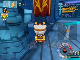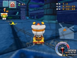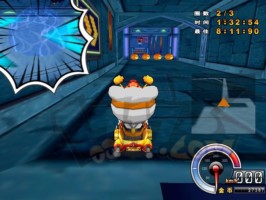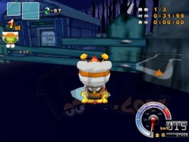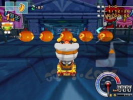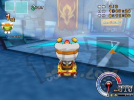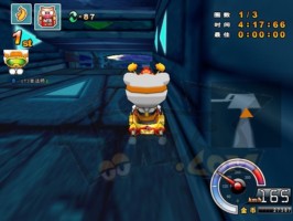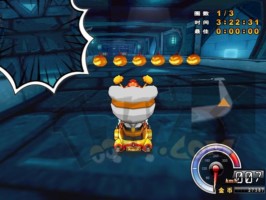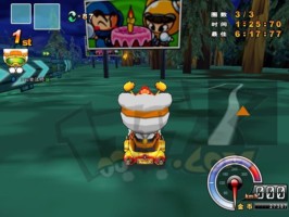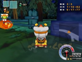 | 在快要到终点前的地方,即最后一个道具带之前的木栅栏有一处小缺口,那是可钻进去的哦。里面的风景还是不错的:)虽然说进到这里可以不用担心水泡的进攻,但是要进到这里需要在出第二条近道之后对车子做很多微调,比较耗时间。另外到这里面之后也不能开得太远,否则的话会被系统判定为方向相反,到时要是按复位键的话,会回退到最后一个道具带之前的。 |