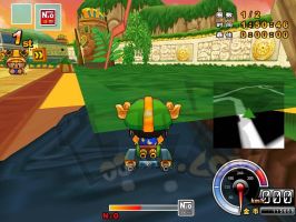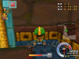 | 再往后开就会看到一段比较窄的石路,通向黄金坐标。这里略有一些难度。在石路弯道上连喷熟练的可以用连喷过弯。如果不熟练的可以在前面抓地,在弯道顶点处使用一个最佳化飘移。确保卡丁车能够靠黄金坐标左边一点位置进入。 |