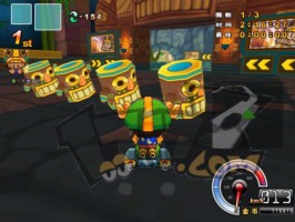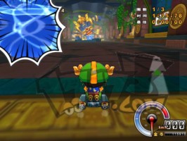| 过了那段上坡之后就会看到巨大的黄金神在断用脚踩踏地面,旁边的石块会因此弹起,建议靠左右两边行驶。另外水泡可以用来封锁黄金神后面的出口,比较容易命中前方不远的对手。 |