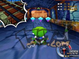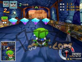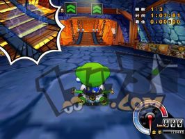 在第一条索道下方有一处U型弯,这里有一个道具带是可以直接抓地双吃的。如上图卡丁车所对准的位置,直线行驶过去即可。这个弯道也是适合用水泡截击,或是用香蕉皮,地雷阴人。 |