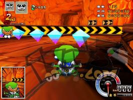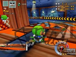 | 到达上图的弯道处,推荐使用一个最佳化飘移过弯。将水泡能够精确扔在此处也是不错的截击区域。如果你是在比较前位置手上有香蕉或地雷,那在过弯之后马上使用也是很好的投放点。 |