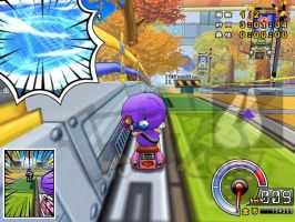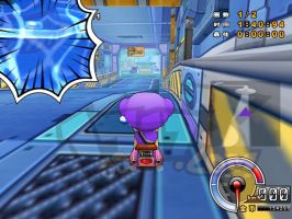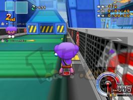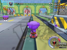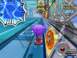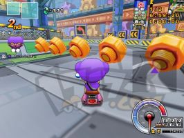 | 加速带上那一个类似压印机的东西,由于在反向地图中会先踩中加速带上的喷射器,速度不太好控制。一般在踩上喷射器前就要观察好压印机是否正准备落下了,如果是那还是按住下适当减速,以免被压到而复位到后方。同时在这加速带上也是很适合放置香蕉或地雷之类的道具。 |