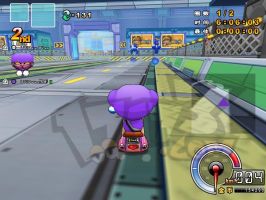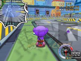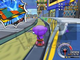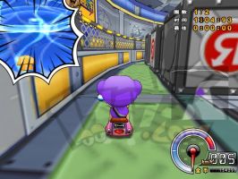 过了加速带之后,就可以开始贴边行驶。前方不远处虽然有一些铁箱子挡路,还是有留下了点缝隙,可以在右边行驶抓地通过的。另外,快到箱子处的时候,投掷水泡会在下个道具带炸开,也比较容易命中前方不远处的对手。 |