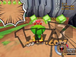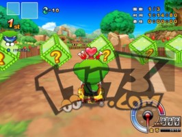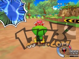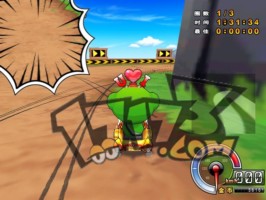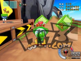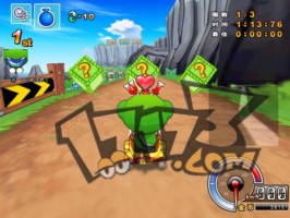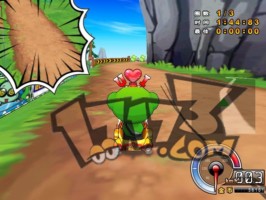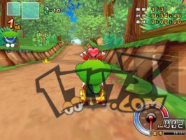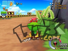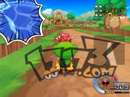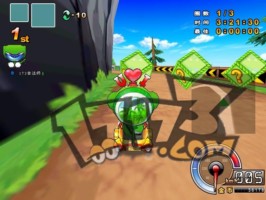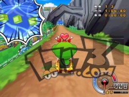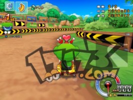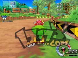 在上下起伏的道路中,将香蕉皮放置在上坡最高点到开始下坡的临界点上都有比较好的隐蔽效果。但此路面并不是太峡小。要想让对手中招的话,还得靠一点运气。一般对手离你比较近的话,通过观察小地图尽量与他保持一条直接行驶,然后再放香蕉皮。 |