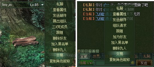 | 在游戏过程中,玩家会经常遇到需要向其他玩家购买物品的情况。此时玩家可以实用交易功能与其他玩家进行交易。玩家之间的交易不受等级、公会、等的限制。 第一步:发起交易申请 1) 选中要交易的玩家,左键点击该玩家界面上方的快捷图标,从弹出的下拉菜单中选择交易选项; 2)从聊天框中要交易的玩家名字上点击右键,从弹出的下拉菜单中选择交易选项;