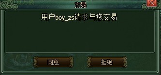 第二步:对方同意申请开始进行交易 1)当您向对方发送交易请求后,对方屏幕中间弹出交易提示界面。 2)同意该请求,则会打开交易窗口。不过需要注意,如果交易双方距离较远,将会失败而无法进行交易,所以进行交易前双方尽量靠近一些。