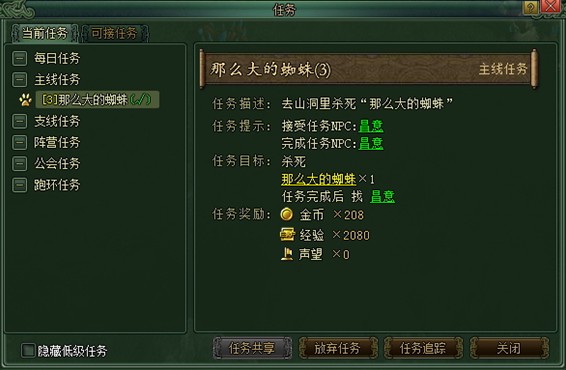 【当前任务】 在当前任务内显示玩家当前已经接受的任务列表,选中任务后,在任务面板右边可以查看任务描述、任务提示及任务目标、任务奖励。 在任务描述和任务目标的介绍中,玩家会看到有部分文字带有下划线,点击带下划线的文字,如果下划线的文字所指向的目标与玩家所在的地图相同,则可以自动移动到下划线所指向的,目标附近。 【可接任务】 在可接任务内显示玩家当前可以接但是还没有接的任务,玩家选中任务后,同样可以在右边查看任务描述、任务提示和任务目标。在任务提示和任务目标的介绍中,玩家会看到有部分文字带有下划线,点击带下划线的文字,如果下划线的文字所指向的目标与玩家所在的地图相同,则可以自动移动到下划线所指向的目标附近。 【任务追踪】