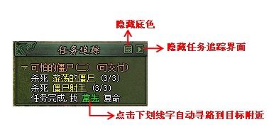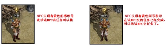 在任务面板下方有“任务追踪”选项,点击该选项,任务追踪会在玩家游戏窗口右边显示出来,方便玩家了解任务进程。 在任务追踪中,同样有部分文字带有下划线,点击这些带下划线的文字,则可以自动移动到下划线所指向的目标附近。 除了在任务界面里面可以查看任务情况,玩家也可以直接通过NPC头顶显示的问号、感叹号等情况获得在该NPC处的任务信息。 除了在任务面板里面可以查看任务情况,玩家也可以直接通过NPC头顶显示的问号、感叹号等情况获得在该NPC处的任务信息。