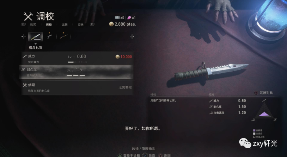 这么好用的小工具让人想到一代小刀通关的奖杯设计,可是在这款游戏中,匕首是有耐久的,并不能无度使用,在面对精英怪和BOSS的时候,匕首的耐久掉得会更快,因此游戏的奖杯也从“只用小刀通关”变成了“只用小刀和枪通关”。