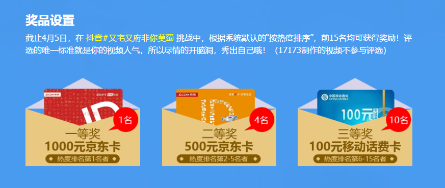 与此同时,官方也没有吝啬于奖励这些有趣短视频的作者,京东卡、话费卡等等奖励拿到手软!看到那个上传的按钮了吗?那可是正在向你招手的千元大奖啊!