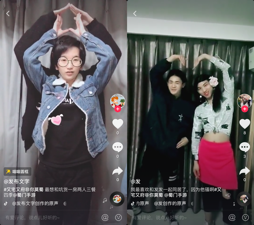 你以为就单人挑战的吗?不不不,还有同居两人一起组队参加活动的。看到没,两个可爱的小姐姐给我们表演“又宅又府非你莫蜀”的手舞呢。emmm,但是下一组是个什么鬼,两个小哥哥,不应该是一个小哥哥+一个女装大佬,可是这也太不走心了吧,感觉我要瞎了,你们角色呢?