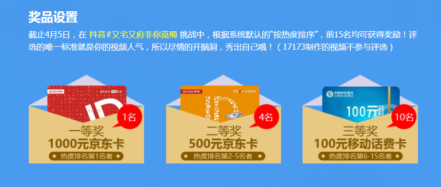 至于参赛的奖品,一等奖是“1000元京东卡”,二等奖为“500元京东卡”,三等奖是“100元移动话费充值卡”。此次活动,不仅好玩奖励也非常的丰厚。没有任何条件规矩的限制,大家可以开动头脑风暴,赢取大奖了。
