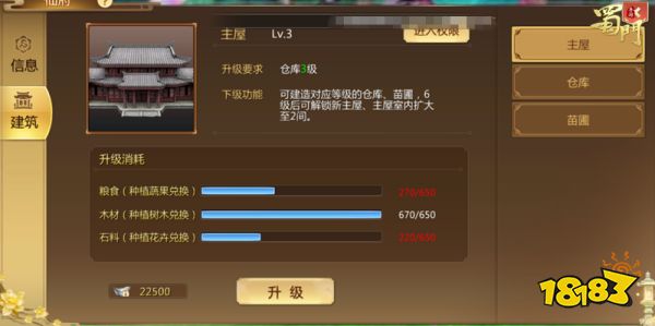 天地之间,有一处世外桃源隐秘云层之间,每位蜀友都能拥有一个家。打开仙府的主界面就可以看到仙府的详细信息和仙府的建筑,升级建筑是所有玩家的首要目标!仙府建筑分为主屋、仓库、苗圃,这三个建筑相辅相成,需要同时升级。