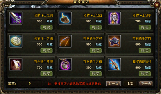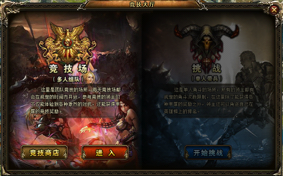 在自建的房间里,房主可邀请公会成员、自己的好友或此刻在大厅里的玩家进入房间,同一个房间的成员即作为一支参赛队伍。点击开始按钮后,系统将会对已报名的房间进行撮合匹配,匹配到合适对手即开始对战。 战斗胜利后,玩家将获得数量不等的“勋章”作为奖励,积攒到一定数量后可在“竞技商店”兑换属性不俗的各职业紫色装备及经验书、绝版药水等道具。