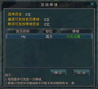 国王在主城的NPC“国家管理员”处,每星期可以在此发放官员俸禄和领取俸禄等操作。