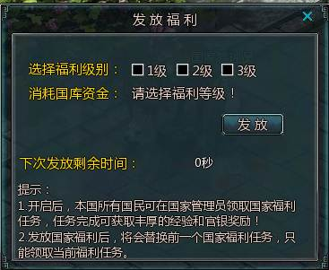 国王在主城的NPC“国家管理员”处,向国民发放国家福利