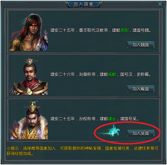 主要升级方式:做完1-15级所有主线任务 成长重心: 1、跟着主线任务做下去,可以很快了解游戏的基本操作以及主要NPC的作用,经验等级也是嗖嗖的往上直涨,不会遇到升级的瓶颈,同时除了极小部分怪物比较危险以外,其他怪物不会对玩家的安全造成危险。新手村是禁止玩家进行PK的,因此同样不会受到其他玩家的攻击。 2、新手村的黄巾战场,再现了黄巾纷乱时期,各路诸侯与黄巾军的厮杀场面,玩家可以帮助各路诸侯与黄巾军进行生死搏斗! 3、在新手村的倒数第二个任务中,玩家将接触游戏的第一个副本――太平宫。在这个副本中,数个历史著名将领将帮助玩家直捣黄巾老巢,击败黄巾军的头目张氏三兄弟。 小贴士:在新手任务期间有许多操作和常识引导,各位新手玩家要多多注意哦! 16-25级 在完成新手村最后一个任务后,玩家将做出乱世人生中最重要的一个抉择,是加入实力雄厚的曹操所在的北魏帝国?还是踏入入义薄云天的刘备所在的西蜀之地?抑或是拥有大小乔的孙权所在的东吴水乡?