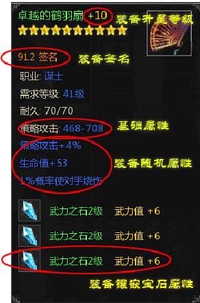 【装备等级】 装备都有最低等级要求,需要达到相应等级及该等级以上才能使用这个装备。可将鼠标放到装备上可查看等级要求。未满足等级要求的装备,等级需求显示为红色。 【装备获得】 装备可以通过以下途径获得: 1、打怪掉落 2、在NPC防具商、武器商和首饰商处使用银两购买 3、任务奖励 4、装备合成 5、从其他玩家处购买 【装备属性】 装备基础属性包括:物理攻击 策略攻击 物防防御 策略防御 生命值 装备随机属性包括:附加生命值,附加策略值,物理攻击百分比,策略攻击百分比,物理防御百分比,策略防御百分比,生命百分比,攻击速度,移动速度,重击率,致命率,武力,智谋,统率,兵法,体质,概率使敌人进入冰冻状态,概率使敌人进入灼烧状态,概率使敌人进入麻痹状态,概率抵抗冰冻状态,概率抵抗灼烧状态,概率抵抗麻痹状态,技能等级加成 装备随机属性只有蓝色装备以上才会出现,随机生成。