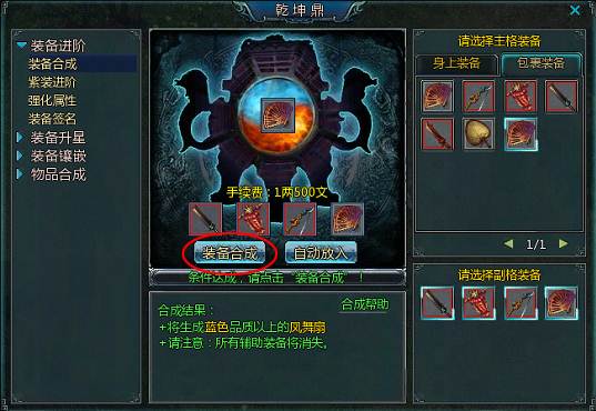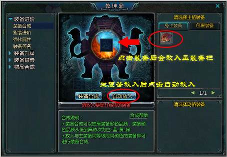 包裹修理:可对包裹中耐久度降低的装备进行修理 【装备合成】 白、蓝、黄色品质装备可最高合成卓越的绿色装备,让你的装备品质提升,变废为宝! 使用4锻造石可锻造一次装备,锻造后的装备品质将得到提升。 锻造石等级限制向下兼容,但是无法锻造装备等级高于锻造石等级的装备。 锻造后,装备的基础属性和随机属性重新生成;签名,星数,镶嵌宝石等均保留。 操作方法一:选择想要锻造的装备,点左键在下拉菜单中选择“装备锻造”,自动放入乾坤鼎并自动选择4个锻造石放入,点击“装备锻造”即可。