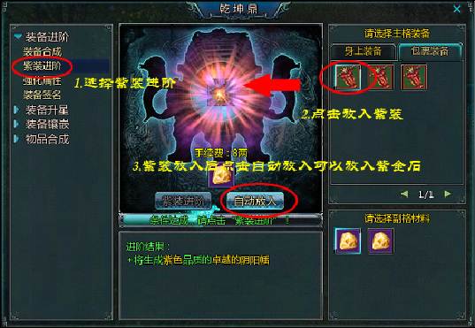 可将绿色品质装备进阶为紫色品质装备,进阶后,装备的基础属性提升,随机属性中的攻击百分比,防御百分比,生命百分比最大上限提升。 60级以上的8星卓越绿色装备可以进阶成紫色装备,进阶需要使用紫金石,进阶后,星数保留。 【紫金石】 紫金石分三种紫金石-武器,紫金石-防具,紫金石-首饰 紫金石-武器可进阶武器和副手 紫金石-防具可进阶衣服,护腕,腰带,鞋子,头盔 紫金石-首饰可进阶戒指和项链 注:紫金石碎片只可在日常英雄挑战副本中获得,5个对应的紫金石碎片可合成1个紫金石。 打开“铸造”界面选择“紫装进阶”,放入需要进阶的装备和对应部位的紫金石,即可进行紫装进阶。