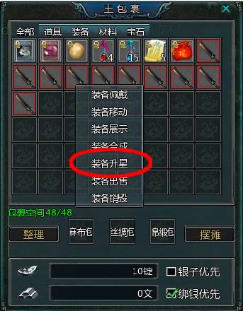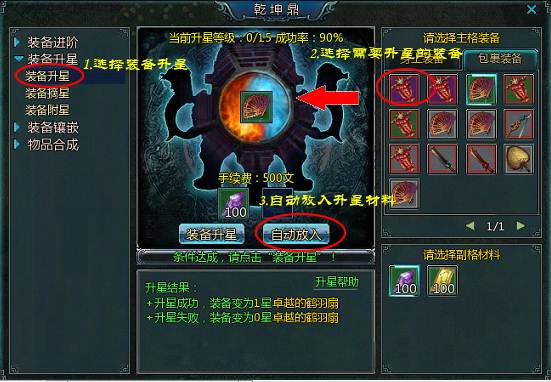 装备升星可提升装备的基础属性,提升装备的攻击,防御或生命值 装备升星需要星石,不同星石升星成功的概率不同。星数越高,成功率越低,当然,你也可以放入星符提升升星的成功概率。 升星成功后,装备星星数+1,升星失败,装备星星数-2,最低可降到0星。 可选择需要升星的装备点击左键