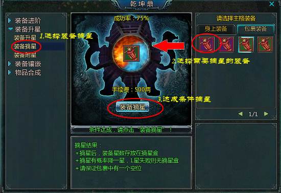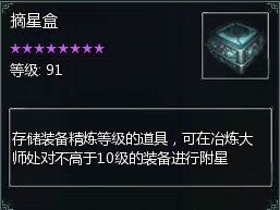 如果想更换更高级装备了,不要紧,原来装备上的星星是可以摘下来,重复利用的。 40级以上的装备均可摘星,摘星只需支付一定的手续费即可,摘下后,星星存放在摘星盒中,可将摘星盒的星星附到高一等级段的任何一件装备上。