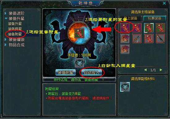 打开“铸造”界面选择“装备附星”,放入想要升星的装备,然后放入合适的摘星盒,即可给装备立即附上星星。 附星会清掉装备上原来带有的星星,10星以上星盒附星会降一星,请谨慎操作哦!