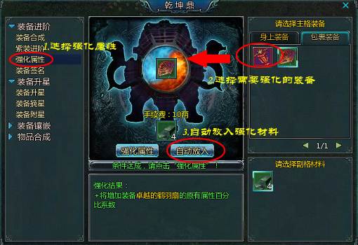 40级以上带有攻击百分比,防御百分比或者生命百分比的装备可以进行强化。强化需要使用对应等级的材料。材料品质越高,随机生成的百分比数值越大。 可在“铸造”界面选择“强化属性”,放入合适的装备和相应的材料,即可进行强化。