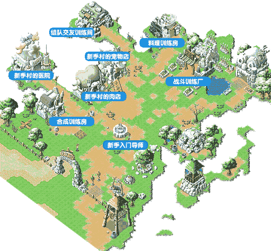 玩家一开始会出现在新手村内,请玩家们寻找以下npc人物,这些人物都是新手的导师,个个身怀绝技,上知天文,下知地里,新手们可以向他们学习原始人生活的技巧,而且等级是无限制的呦!不过新手一旦使用新手村门口的传送师出了村子,就不能再进入��!如果玩家还想要捕捉其他的出生宠(乌力乌力、凯比、克克尔、威伯),可以到新手村外的草地上捕捉。
