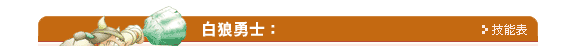 各村落及各族的原始人 被训练或是自已想追求更完美的体能的人,通常职责是保护村落的安全抵抗外敌,或是阻挡因猎食而误闯村庄的各类危险的大型恐龙。他们熟练各种战斗技巧,也得担任村内哨兵的工作。当一名称职的白狼勇士除了战斗能力之外,毫不畏怯的胆识和慷慨赴义的决心才是关键。能力值重体、攻、防,可穿戴大部分防高及攻高的装备。