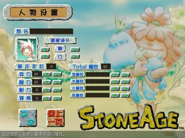 石器7.5版本的人物设定能力值,系统自动将人物状态设定为体力10点(人物的HP),腕力10点(人物的攻击力),耐力值(人物防御力)与速度值(攻击速度)均为0点。