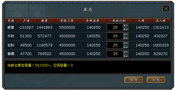 库存的容量由仓库等级来决定,仓库等级越高,容量就越大。