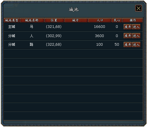 在城池界面中可以查看自己所有的分城,以及分城名字,并且可以立即进入,切换方便,让玩家可以简单的完成操作。