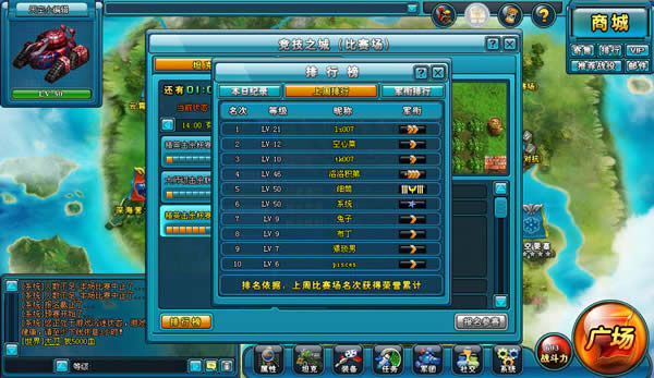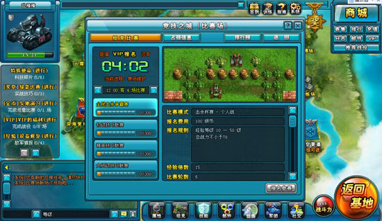为了提高坦克士兵的作战能力,G.T.K开展了全军竞赛选拔科目,以竞赛的形式锻炼勇士们的作战的综合能力。在比赛场中,只有最优秀的人才能脱颖而出,每次比赛你都获得相应的荣誉值,而荣誉值就决定了你将得到的奖励和在军队中的军阶。如果你参加了军团的话,你的荣誉值还会有部分算入军团的荣誉,而影响军团的世界排名哦!