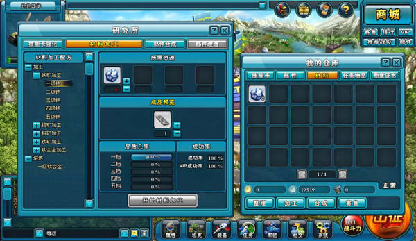 ★在所需资源一栏中,你可以看到加工所需的材料,点击+号可以增加原材料,添加原材料越多加工的成功率就越高。VIP玩家在进行材料加工时可以获得5%的成功率加成。