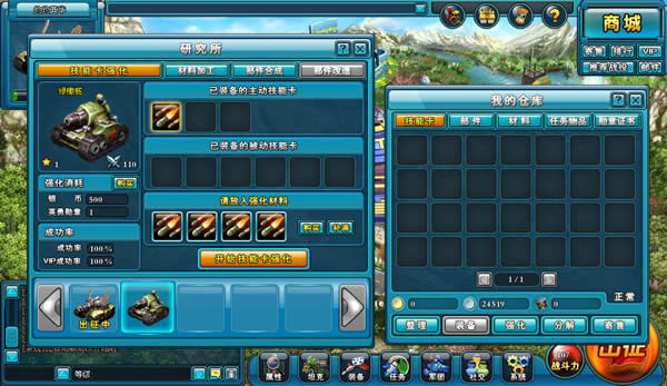 ★点击游戏界面下方的装备或是坦克按钮,打开我的仓库页面。在我的仓库的技能卡分页上你可以找到技能卡强化按钮,点击之后就可以进入技能卡强化界面。 |
