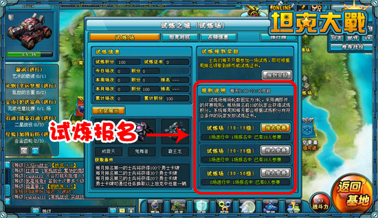 战斗规则和联赛相同,采用积分制,每轮结束后,排行1-6名的玩家将分别得到6-1点积分。最终名次是将每轮战斗所得到的积分相加之后从高到低排列。每轮战斗后玩家都会获得包括银币、经验、荣誉、勋章、材料等等的超值奖励,试炼结束后排名前10的玩家还可以获得试炼积分。 为了鼓励大家参加试炼,每周和每月都会有试炼积分排名,周积分排名靠前的玩家可以获得试炼证书,试炼证书可以换取银币和贵重物品的哦。月积分排名靠前的玩家可以获得勇士卡牌,这可是换取超极品坦克的必备道具。