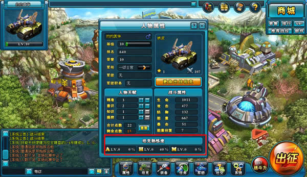 ★点击游戏界面下方的属性按钮,可以打开人物属性界面。人物属性最下方显示的就是玩家对于三系坦克的熟练度。