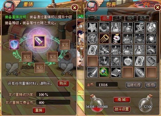 装备可以通过重铸的办法,提升装备的等级。重铸必须消耗重铸石或者铸魂石。越高等级的装备重铸所需要的石头数量也就越多,且重铸有失败几率。 重铸装备说明 1、每颗铸魂石的效果约相当与5颗重铸石。 2、重铸石和铸魂石可以搭配使用,系统可以计算出混搭使用的最终成功率,成功率高于100%的,默认为100%。橙装的重铸成功率会比其他品种装备的低。 3、重铸成功后装备等级上升10级,武器外形图标改变,即默认为重铸获得获得该武器的更高级形态。举例:10级斧头重铸成功后成为20级斧头。 |