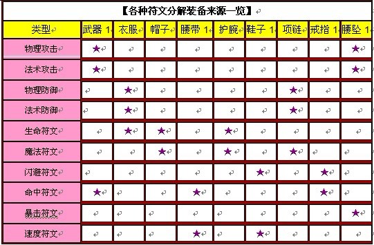 符文是需要通过分解不同的装备获得的。如:武器可以分解出:物攻符文,法攻符文,命中符文,暴击符文。但是具体分解出哪种类型的符文则由系统随机。白色装备无法分解。