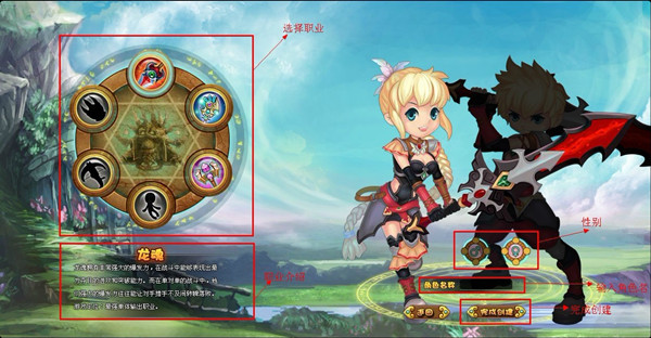 点击界面左边的六环图,可以选择你想要创建的角色职业,角色图像下有按钮可以选择角色性别。界面左下角有相应的职业介绍,你可以根据个人喜好选择想要的职业,在界面中下方可以输入角色名称,最后点击界面中下方的“完成创建”,即完成角色创建,并切换到人物角色选择界面。