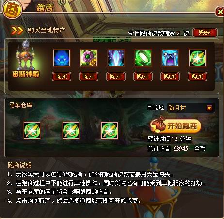 一、跑商规则 1、玩家等级必须达到40级。 2、当前游戏中有4个跑商城市,分别是隐月村、炎龙城、阿托姆城、宙斯神殿,玩家可以在任一城市跑商使者接取向其他三个城市进行跑商(玩家必须达到60级才可向宙斯神殿跑商)。 3、从40级开始每10级每个跑商使者增加一个可购买商品,商品等级越高收益越大。 4、玩家每天可进行跑商3次,每天可购买跑商次数5次。 5、进行跑商时不可进行其他操作。