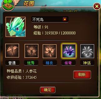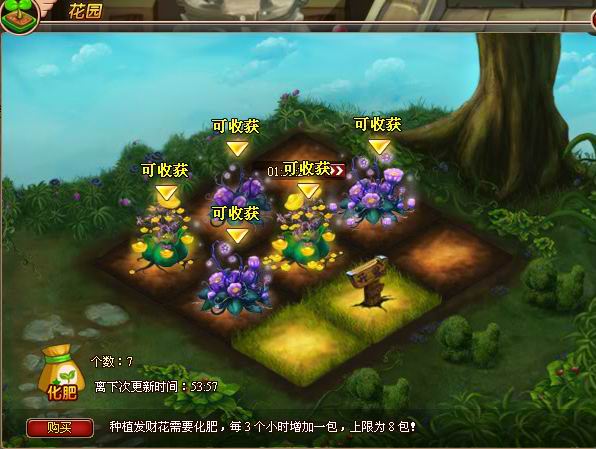 一、花园 1、玩家可以在花园内种植经验花或者发财花,植物收成后可以获得经验或者金币。 2、玩家花园初始种植土地为一块,可以花费一定的天宝扩充种植土地。