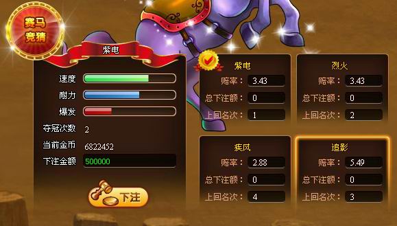 3、赛马属性 ⑴、速度:决定马屁的移动速度。 ⑵、耐力:决定马屁的耐久能力。 ⑶、爆发:决定马屁爆冷几率,爆发越高越有可能成为黑马。